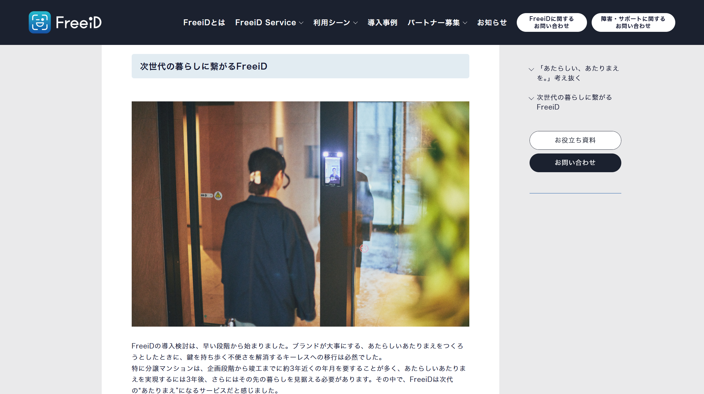 当社は自社開発の分譲マンションの共用部(共同玄関、ゴミ置き場、宅配ボックス)において、顔認証IDプラットフォーム「FreeiD(フリード)」を採用しております。1日の中で頻繁に行き来する共用部への顔認証システム導入は、マンションの利便性向上と入居者の快適な日常生活の実現をめざすものです。